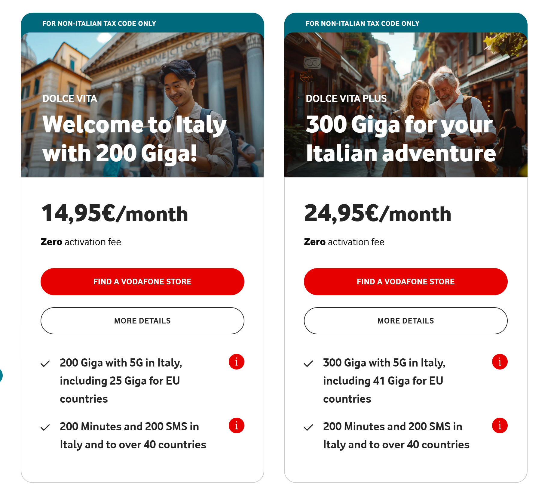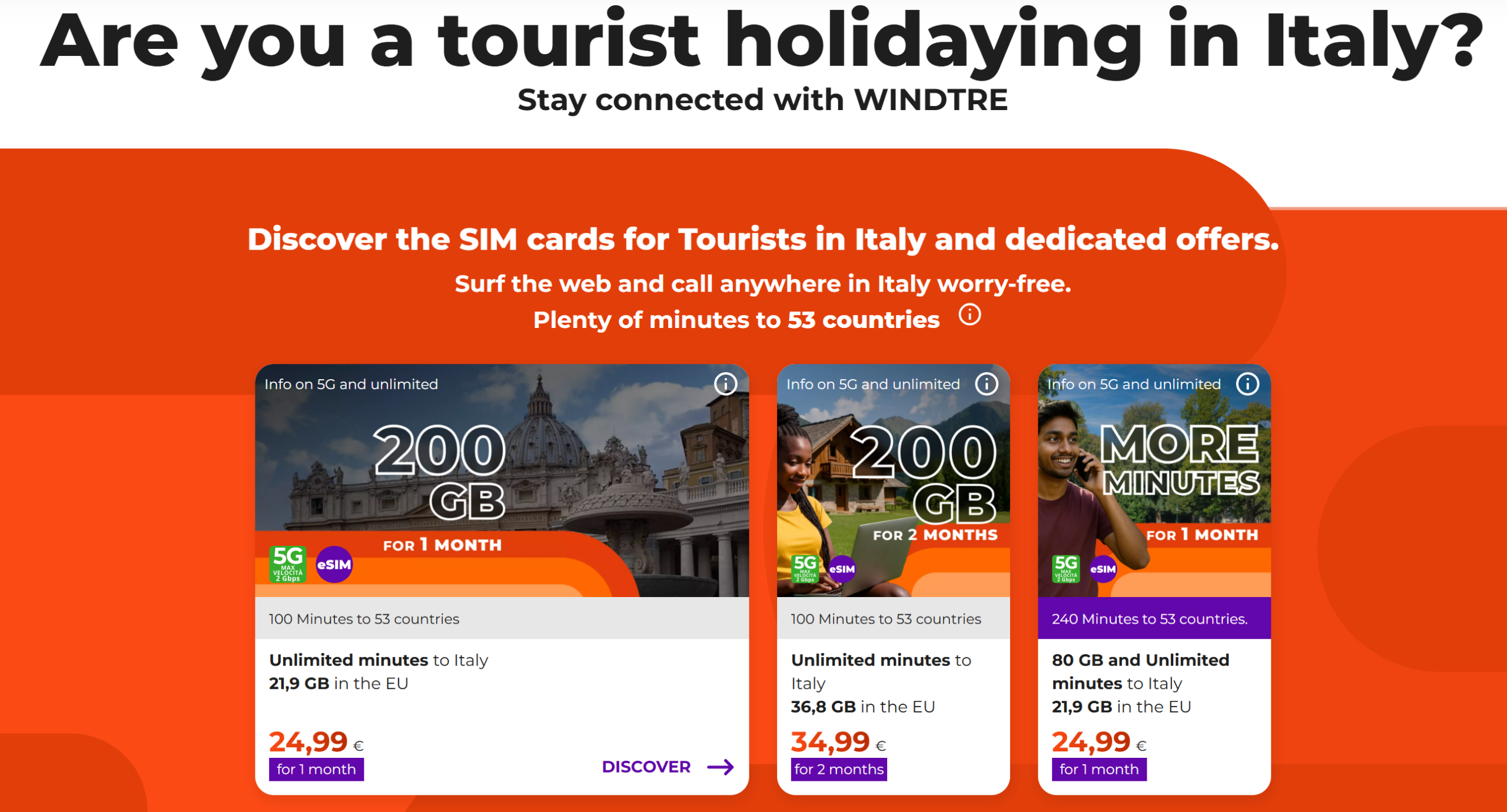 Wir sind sehr positiv überrascht, dass sich so viel für Touristen getan hat! Während Prepaid nur auf gezielte Nachfrage vor Ort eine Option für auswärtige Nicht-Italiener war, gibt es mittlerweile (Stand Januar 2026) etliche Angebote für Touristen zur Auswahl. Das ist Service und Eingehen auf die Wünsche der Kunden! Gut gemacht, Italien 🙂
